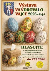 Do Rajca zavítala putovná výstava Vandrovalo vajce 2026, ktorá predstavuje krásu tradičného slovenského zdobenia kraslíc. Návštevníci si môžu pozrieť desiatky originálnych kraslíc z celého Slovenska – maľované, voskované, batikované, odrôtované, vyškriabavané, obliepané či perforované.